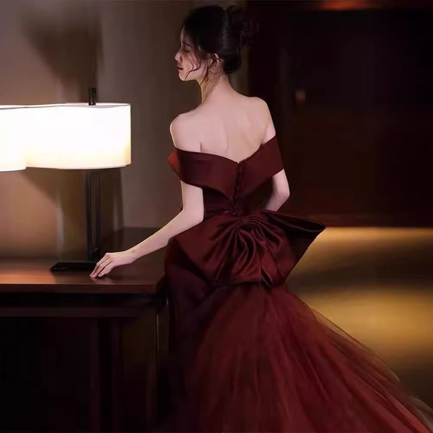 Gown Off-Shoulder Panel Mermaid Evening Bow Mesh Plain