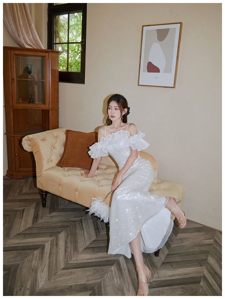 Spaghetti Strap Ruffle Trim Sequin Sheath Evening Gown