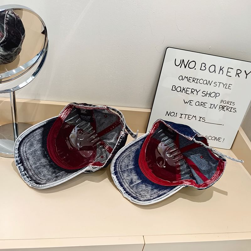 Lettering Distressed Washed Denim Baseball Cap