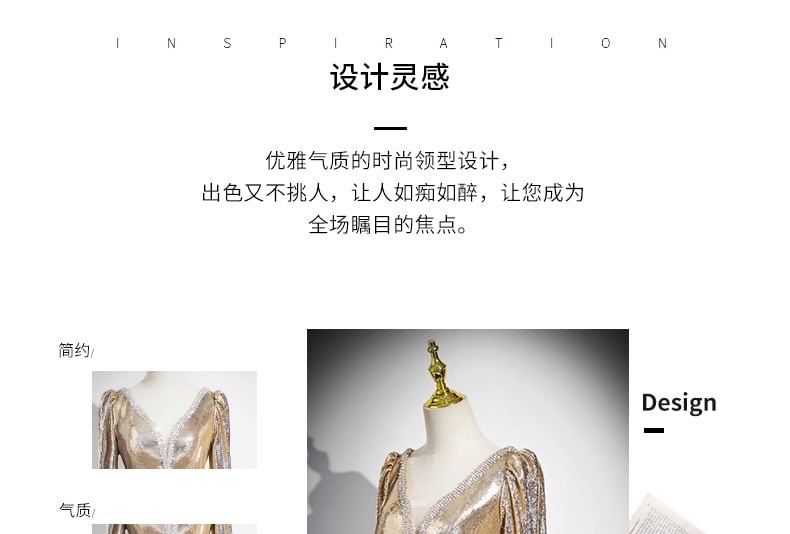 Long-Sleeve V-Neck Gown Sequin Evening A-Line