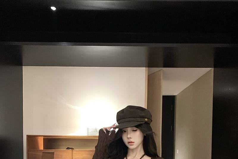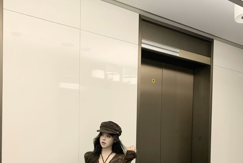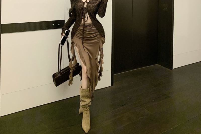 Long Sleeve V-Neck Butterfly Print Tie Front Top / Strapless Plain Ruffle Trim Midi Bodycon Dress