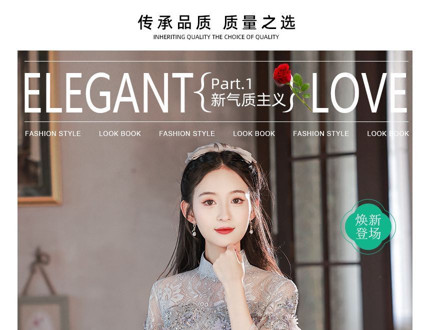 Elbow-Sleeve Mandarin Collar Flower Beaded Embroidered Panel Lace Mesh A-Line Evening Gown