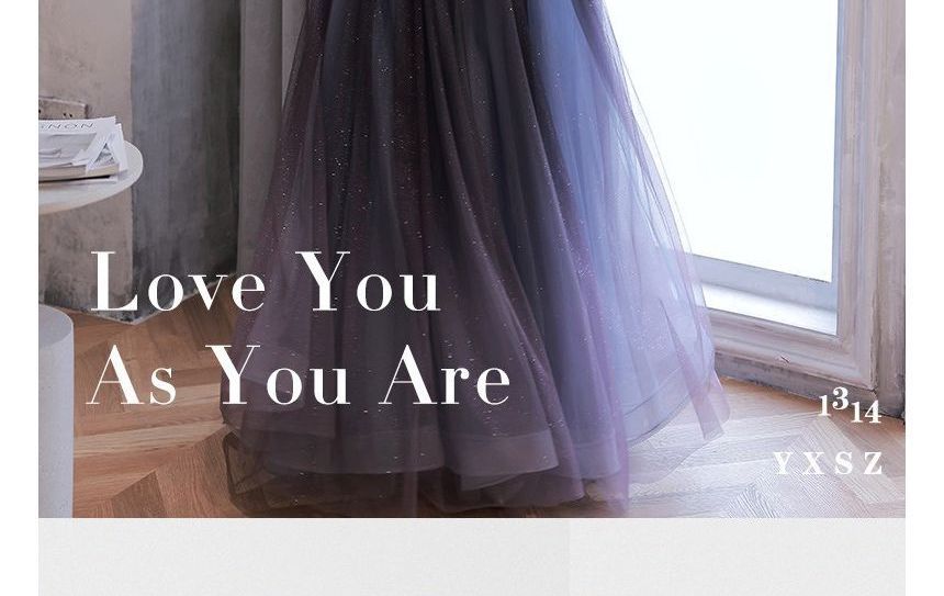 Mesh Glitter Evening Gown Bow A-Line Puff-Sleeve