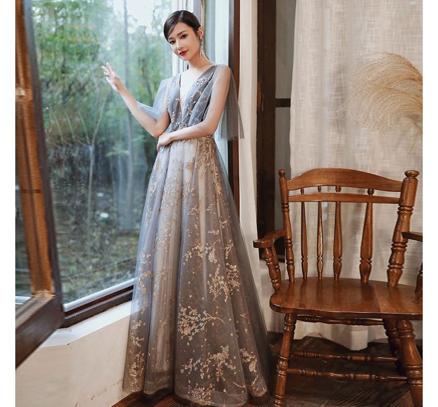 Sleeveless V-Neck Mesh A-Line Evening Gown