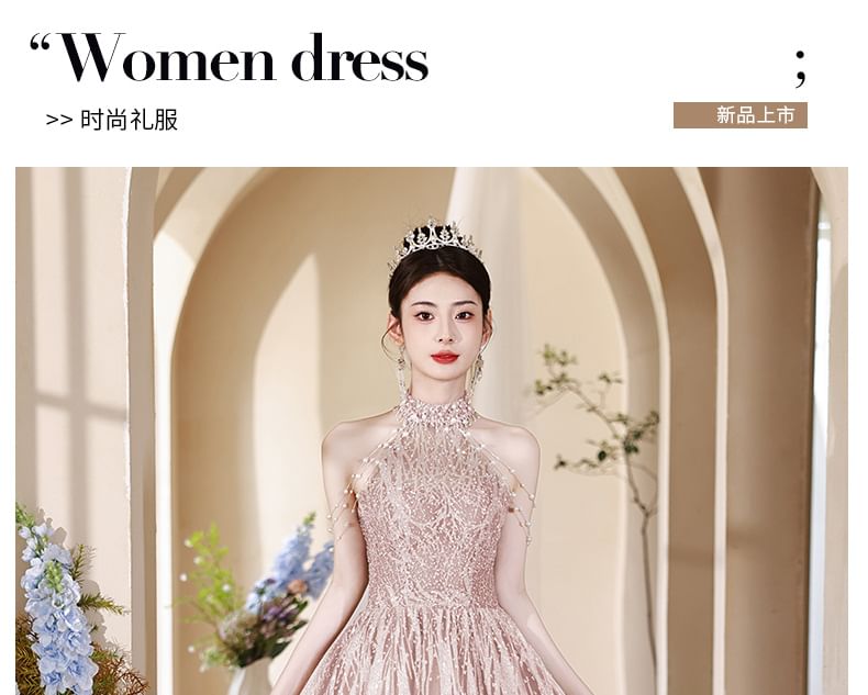 Halter Mock Neck Faux Pearl Fringed Cutout Back A-Line Evening Gown