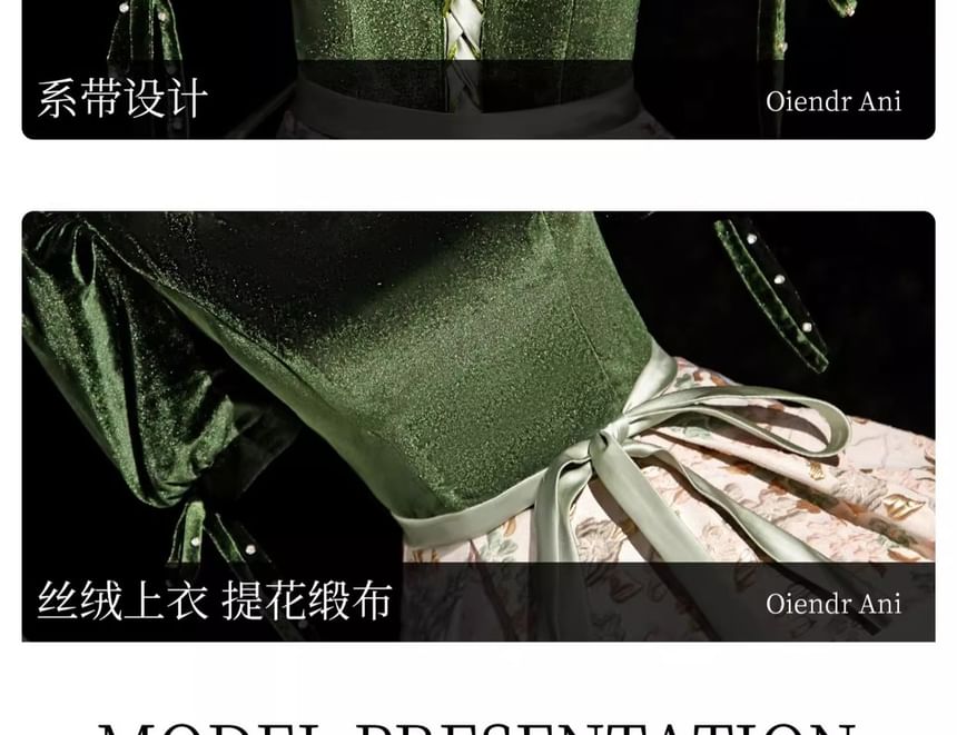 Neck Panel Jacquard Bow Square Puff-Sleeve Gown Accent Floral Ball Velvet