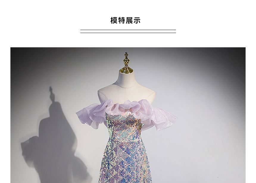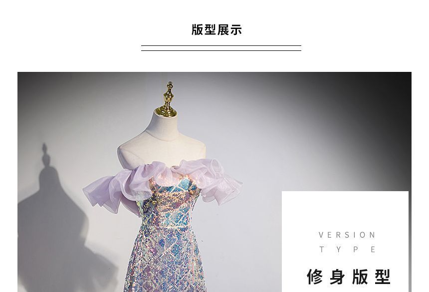 Off-Shoulder Sequined Ruffled A-Line Evening Gown