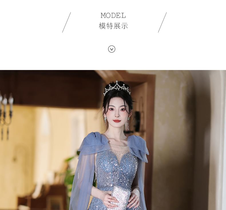 Sleeveless Crew Neck Sequin Sheer Panel Bow Accent A-Line Evening Gown