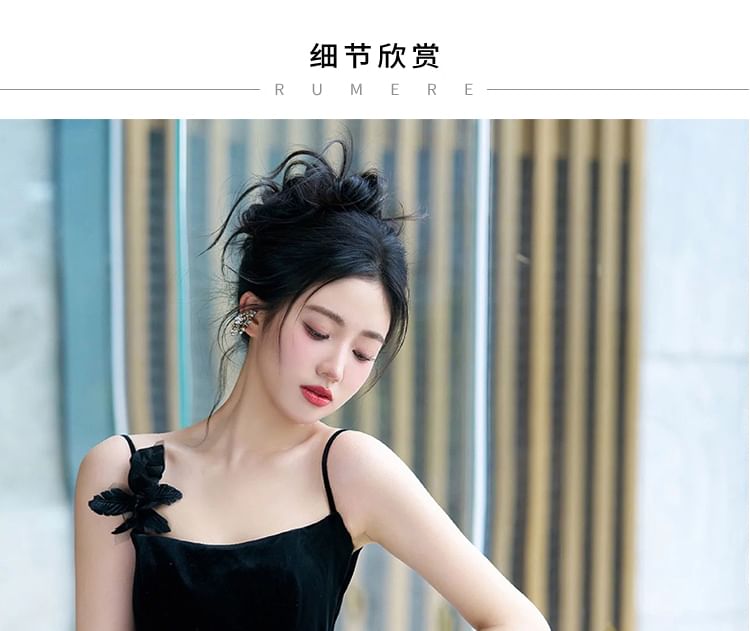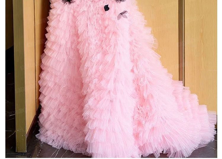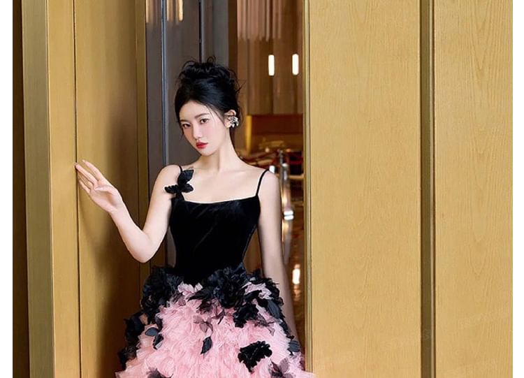 Spaghetti Strap Two Tone Floral Applique Tiered Panel Mesh A-Line Evening Gown