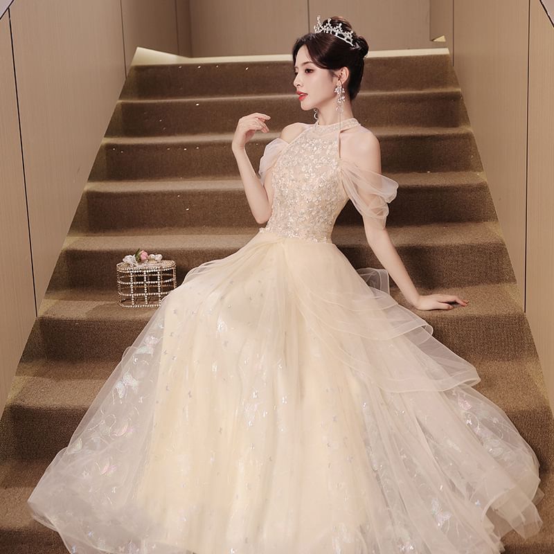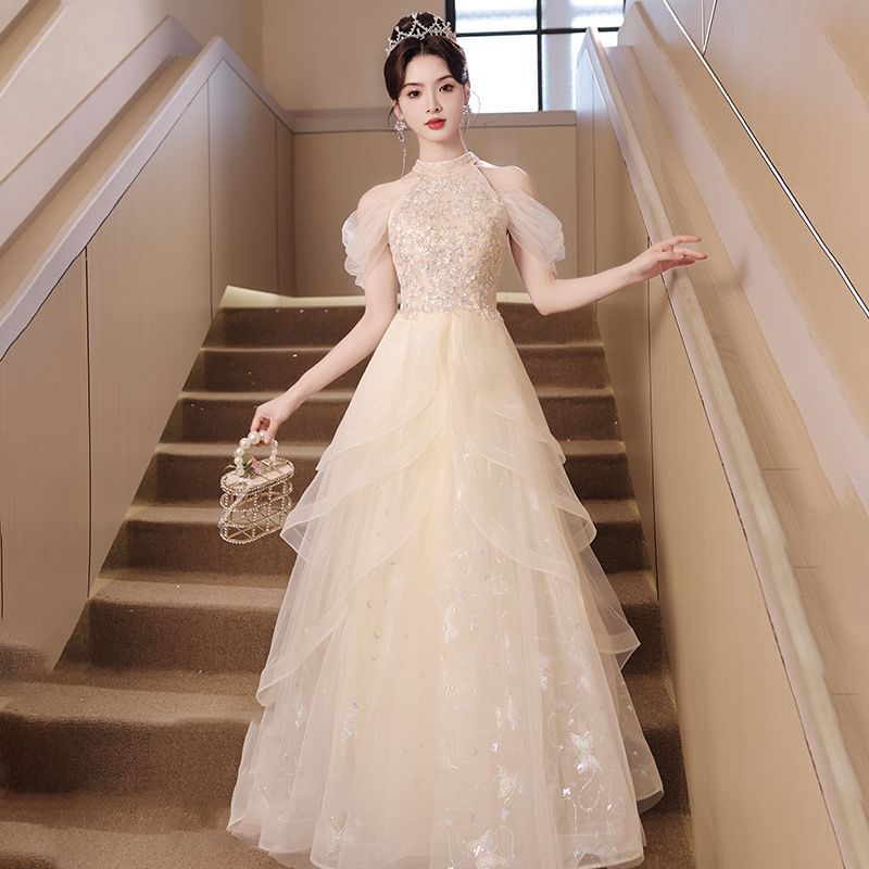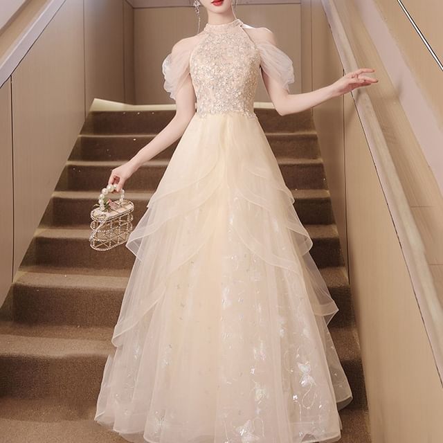Sleeveless Cold Shoulder Sequin Panel Mesh A-Line Evening Gown