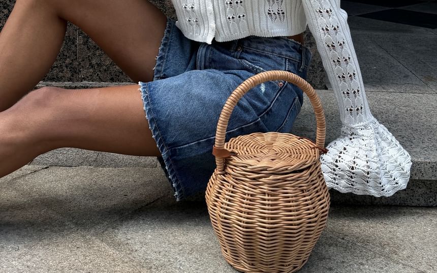 Flared-Cuff V-Neck Button-Up Perforated Plain Crop Cardigan