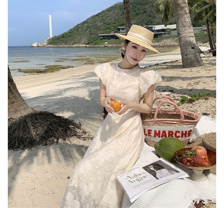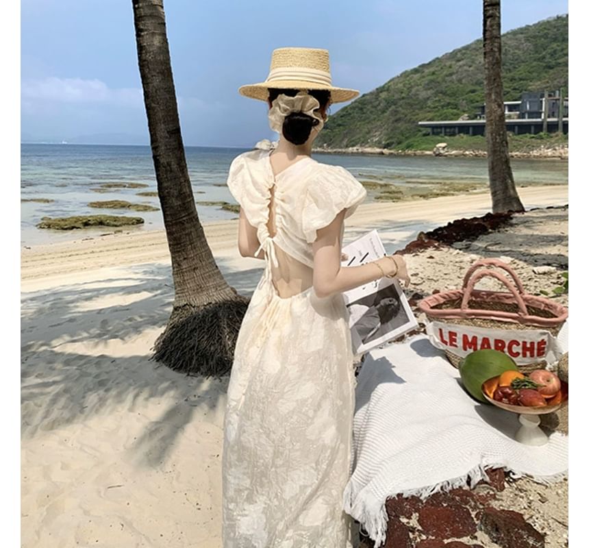 Puff-Sleeve Plain Drawstring Floral Print Open Back Midi Sundress