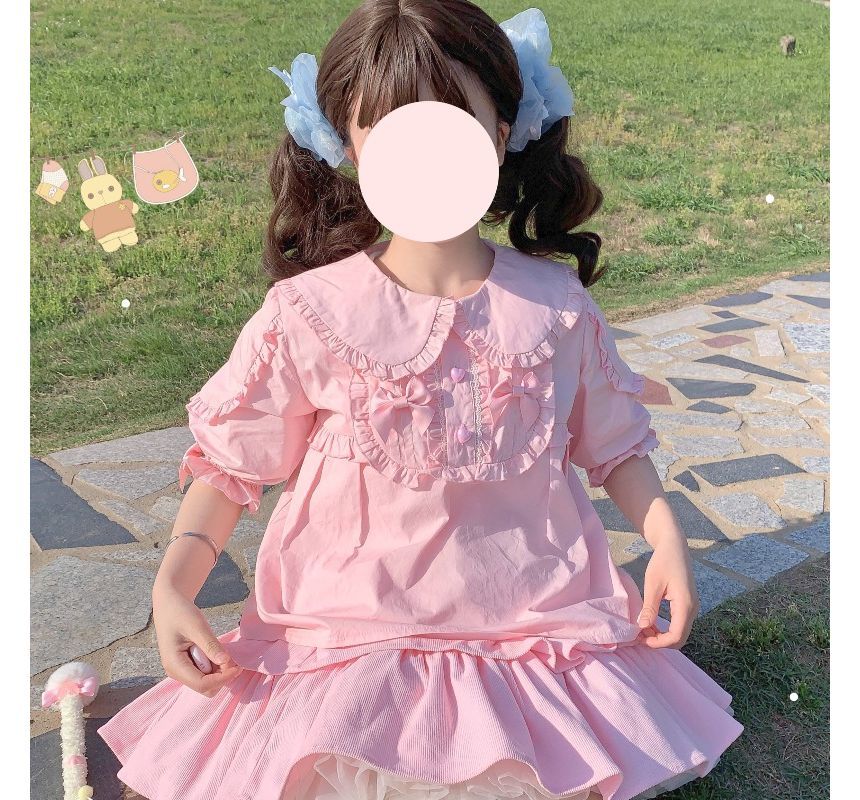 Puff-Sleeve Ruffle Trim Plain Bow Back Blouse