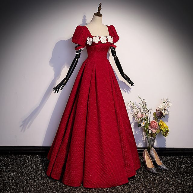 Puff-Sleeve Square Neck Plain Flower Applique A-Line Evening Gown