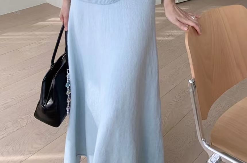 Set: Boat Neck Plain Ribbed Sweater + High Rise Knit Midi A-Line Skirt