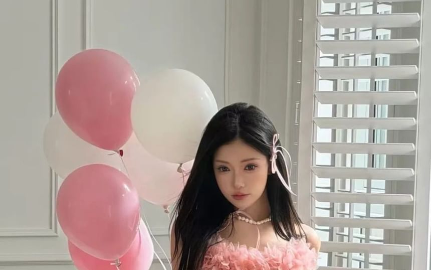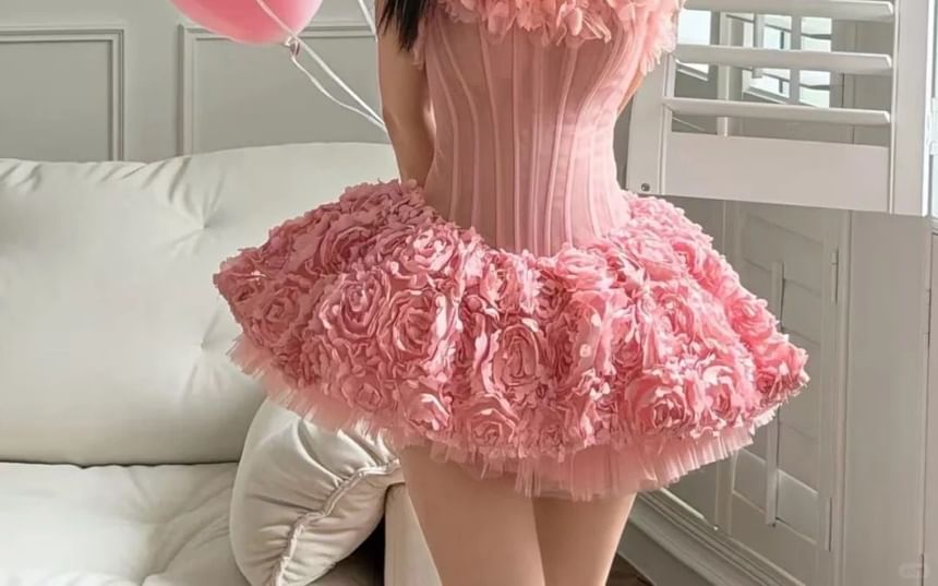Set: Strapless Flower Detail Mini A-Line Party Dress + Plain Shorts