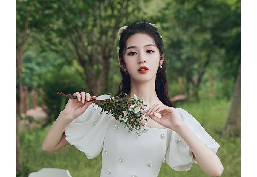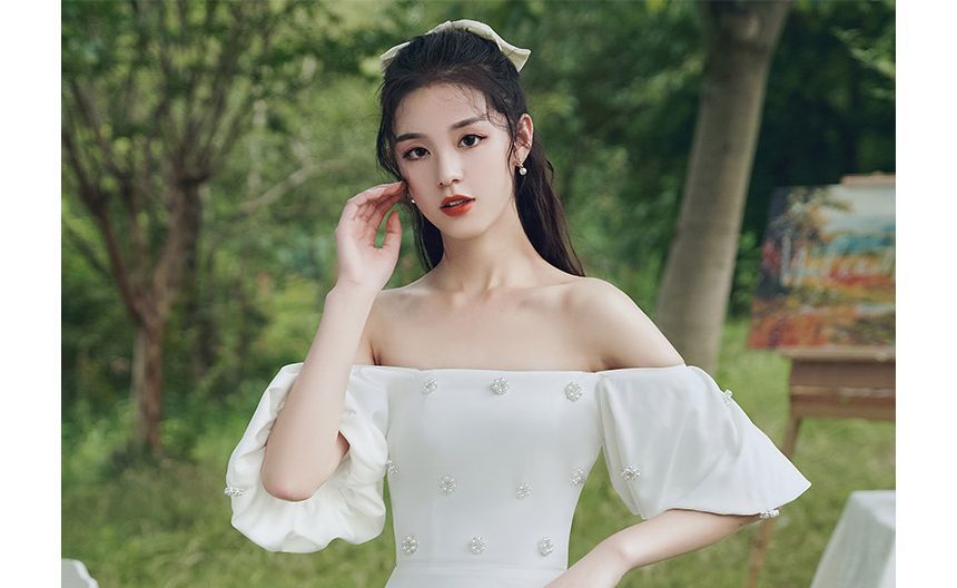Short-Sleeve Faux Pearl Maxi A-Line Cocktail Dress