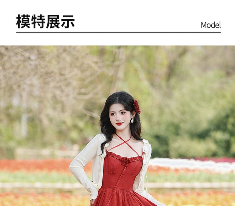 Spaghetti Strap Plain Flower Detail Ruffle Midi A-Line Dress