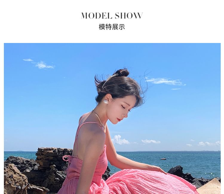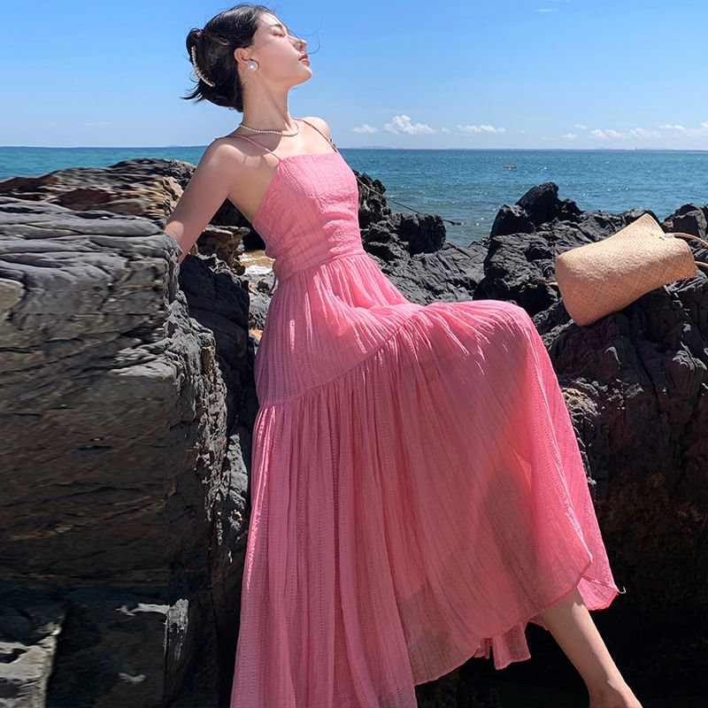 Spaghetti Strap Plain Textured Maxi A-Line Dress