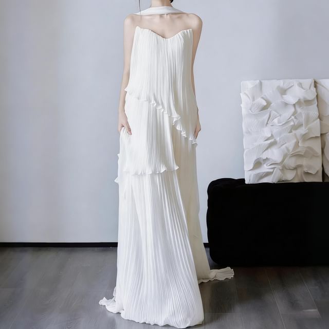 Strapless Ruffle Hem Accordion Pleat A-Line Wedding Gown