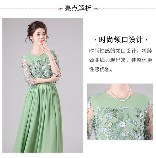 3/4-Sleeve Crew Neck Floral Embroidered Mesh Panel A-Line Evening Dress