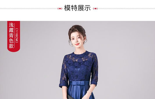 3/4-Sleeve Crew Neck Lace Panel Bow Accent Midi A-Line Cocktail Dress