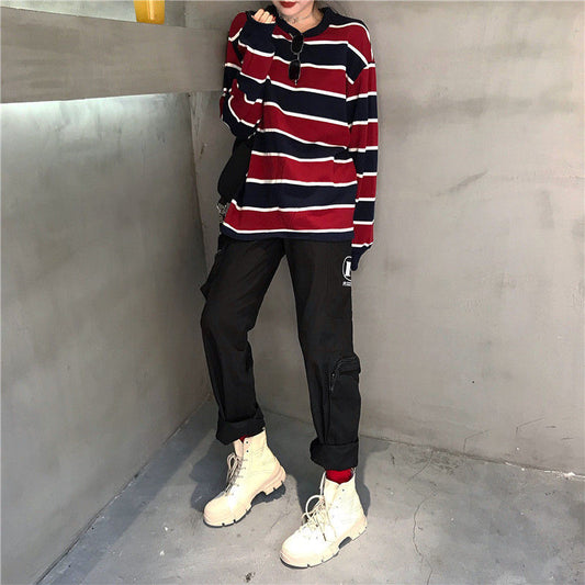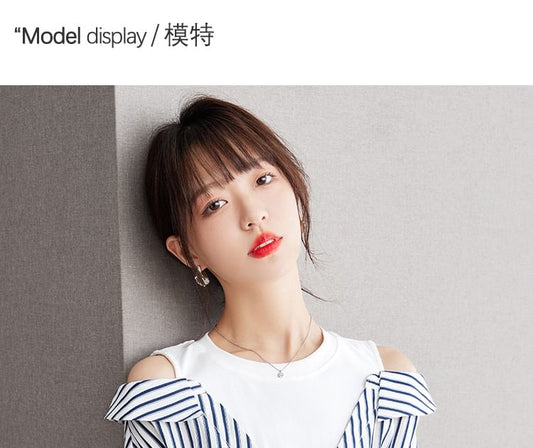 Striped Loose Pants Drawstring Crop Plain Tee / Off-Shoulder Short-Sleeve Waist Trim Fit