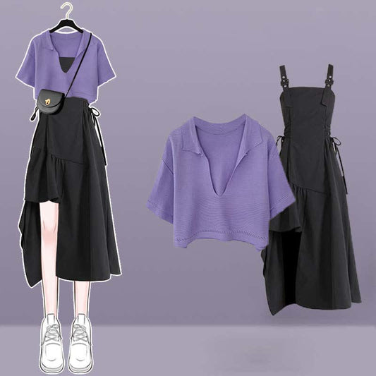 Ensemble t-shirt polo à nouer, haut court et jupe plissée