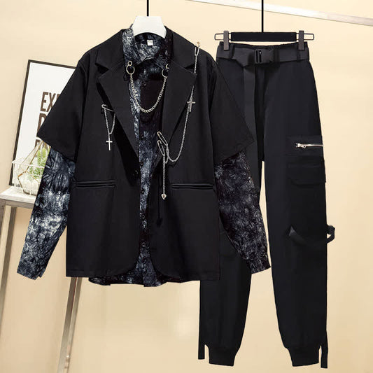 Blazer à revers Y2K Tie Dye Chemise à chaîne Pantalon cargo ceinturé