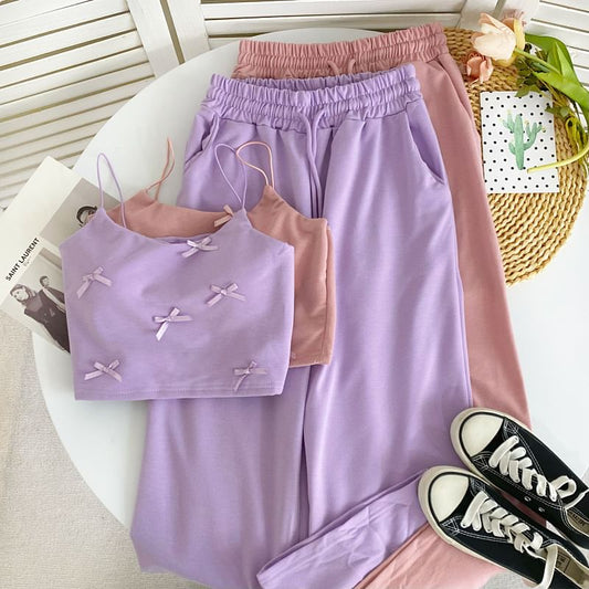 Ensemble : haut court uni à bretelles avec nœud + pantalon de survêtement à jambe large avec cordon de serrage à la taille