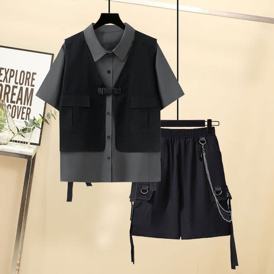 Gilet à boucle gothique avec poche, t-shirt à revers, short cargo à chaîne, pantalon
