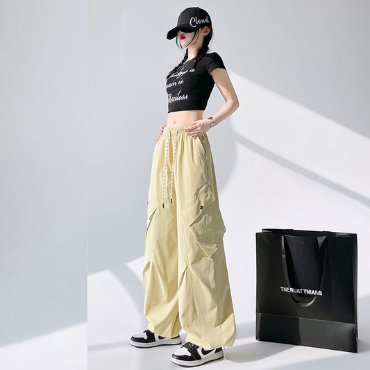 Leg Wide Pants Drawstring Plain Waist Cargo