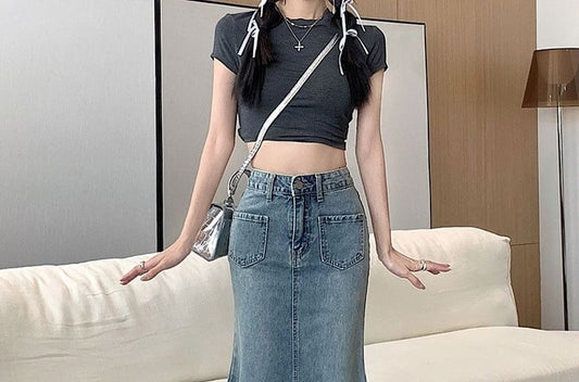 High Waist Washed Fray Midi Mermaid Denim Skirt