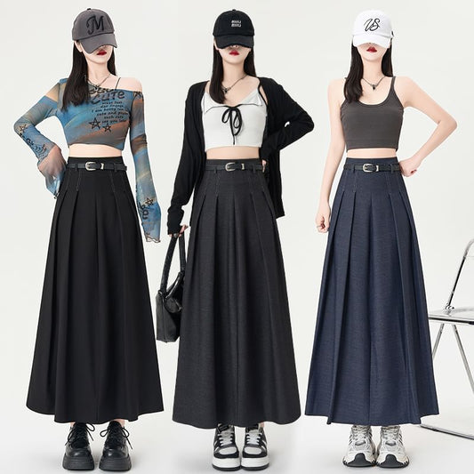High Rise Plain Inverted Pleated Maxi A-Line Skirt