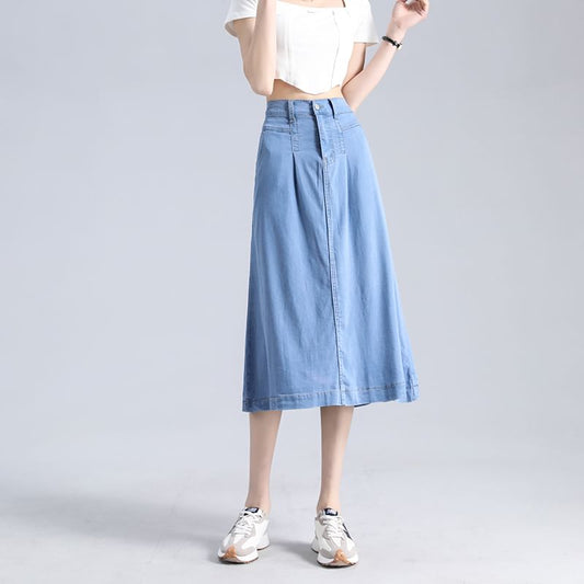 High Waist Denim Midi A-Line Skirt