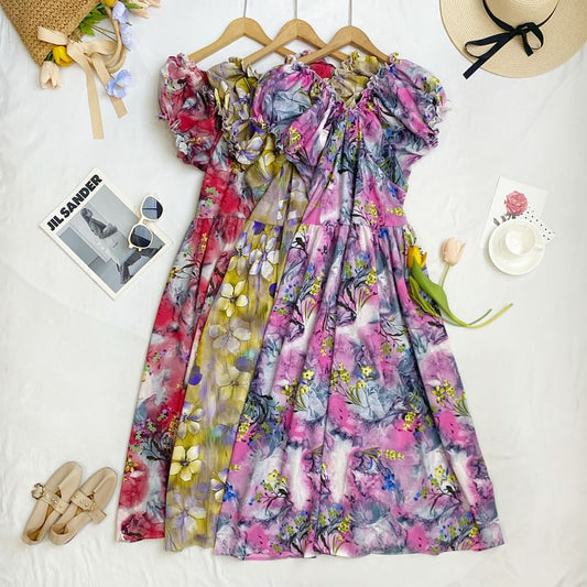 Robe longue trapèze froncée à imprimé floral et à manches courtes et col en V