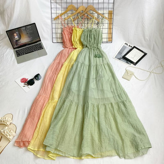 Robe trapèze longue à bretelles spaghetti, unie, à découpes et à nouer