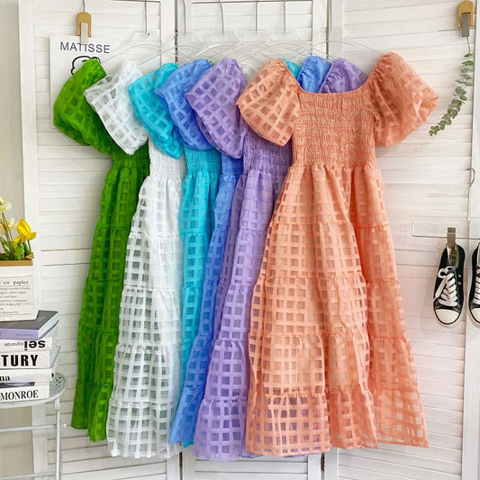 Robe trapèze longue à volants et manches courtes, col rond et uni