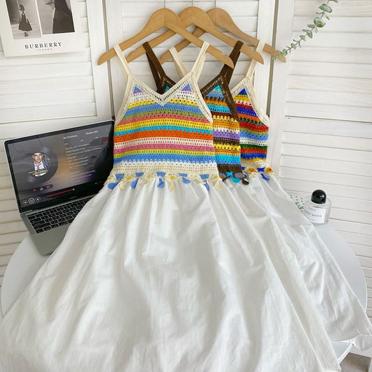 Robe trapèze mi-longue à bretelles spaghetti, col en V, empiècement rayé en crochet