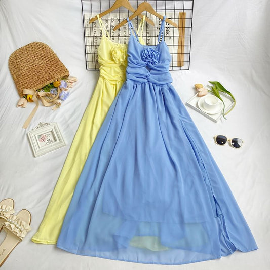 Robe trapèze longue à bretelles spaghetti et détails fleuris unis avec fente froncée et découpe