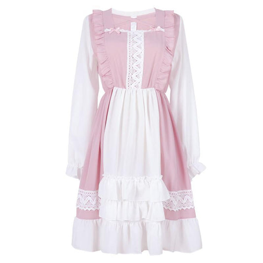 Robe de soubrette Lolita à volants et manches longues avec boutons noirs