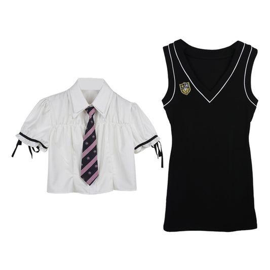 Ensemble chemise plissée à revers et gilet en tricot chic