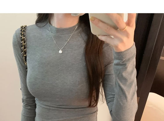 Long-Sleeve Mock Neck Plain Lettuce Edge Ribbed Knit Top