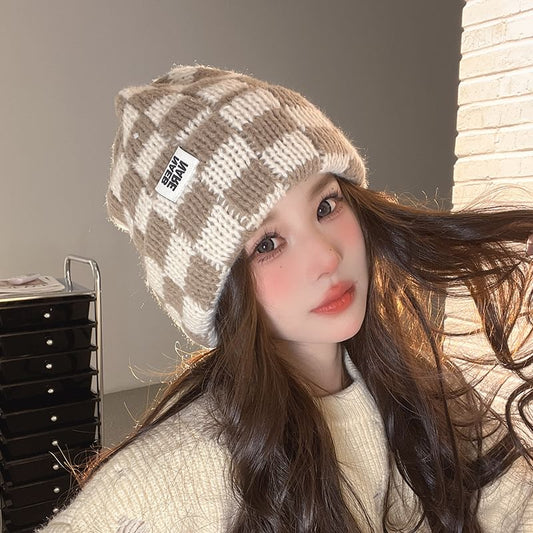 Lettering Applique Checker Knit Beanie