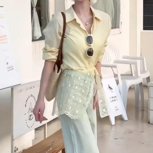 Long Sleeve Collared Plain Lace Trim Panel Shirt