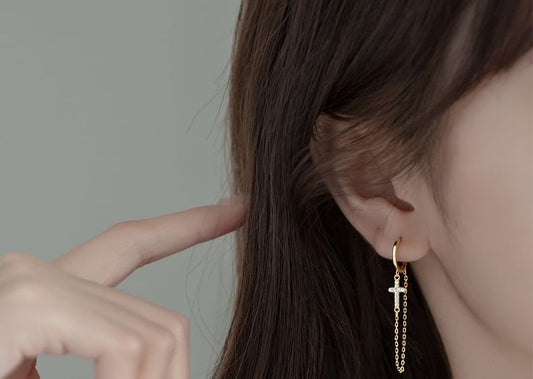 Cross Rhinestone Chain Sterling Silver Dangle Earring