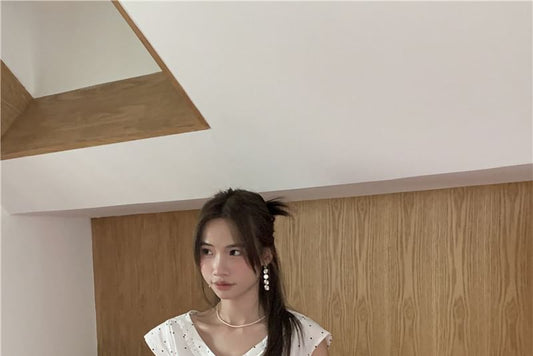Polka Dot Ruffle Trim V-Neck Short Sleeve Cropped Blouse