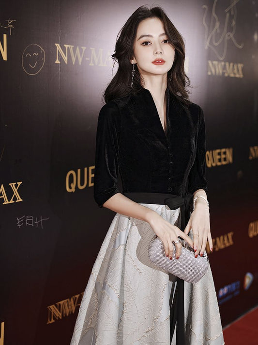 Short-Sleeve Velvet Panel A-Line Cocktail Dress