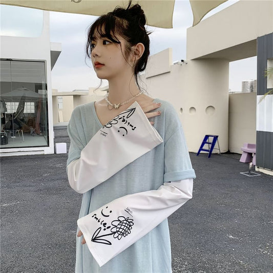 Long-Sleeve V-Neck Plain Flower Accent Slit Midi Sheath Dress