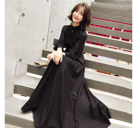 Balloon-Sleeve Mock Neck Plain Ribbon Back A-Line Evening Dress (Various Designs)